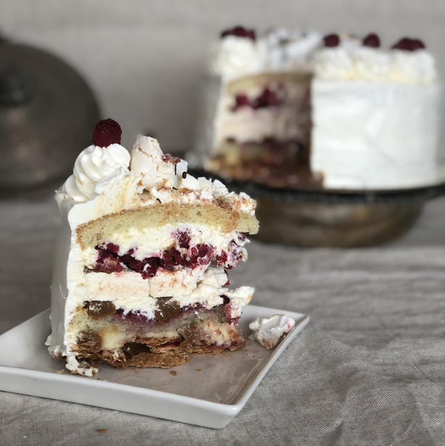 Torta de bizcocho de vainilla, capa de hojaldre y una capa de merengue recién horneado. Rellena con Dulce de leche, crema pastelera, frambuesas y crema chantillí.