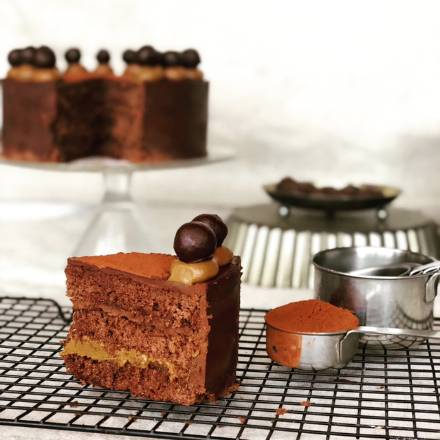 Bizcocho de chocolate relleno con una capa de Dulce de leche y otra capa de trufa de chocolate belga amargo. Cubierta con trufa y bombones de chocolate